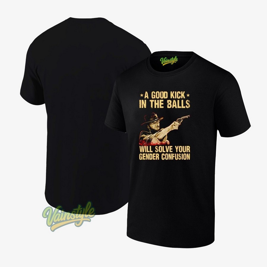 Looking for a unique and daring addition to your wardrobe? Ready to spark conversations and challenge the status quo? Don’t miss out – Buy A good kick in the balls will solve your gender confusion T-Shirt today and make a statement that won’t be ignored!