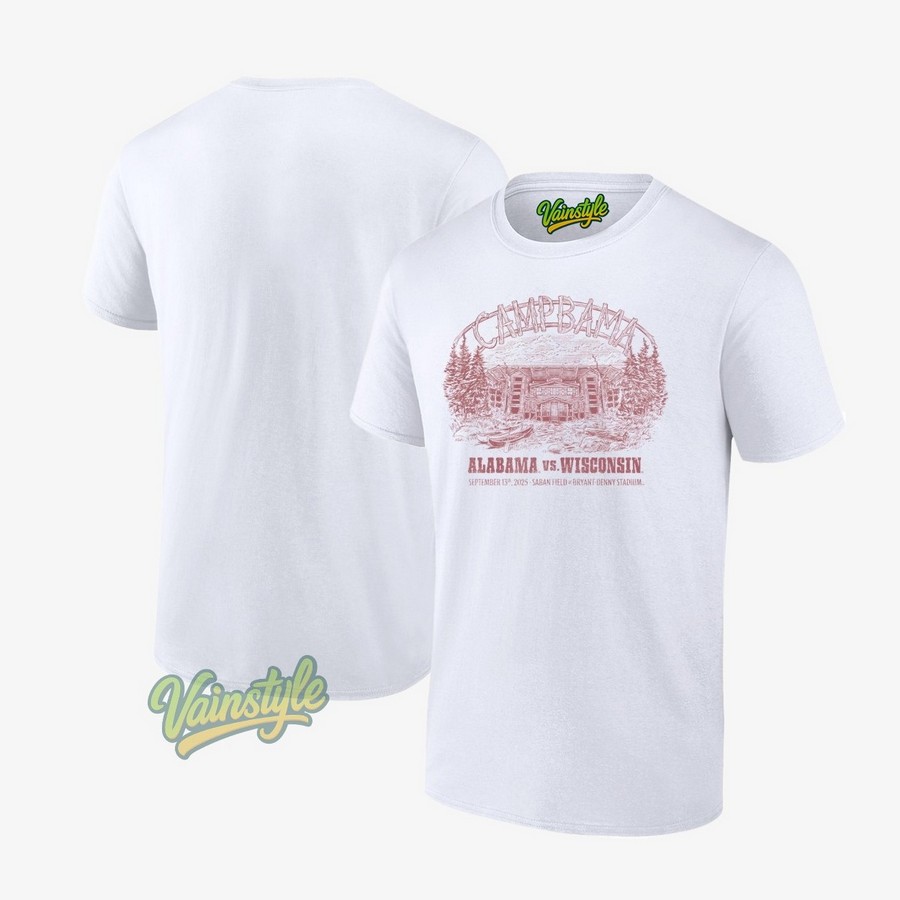 Available in a range of sizes to fit every fan, Alabama Vs Wisconsin 2025 Camp Bama T-Shirt makes a great gift for yourself or any die-hard football lover in your life. Don’t miss out on the opportunity to own a piece of college football history. Show your team spirit and order yours today! Don’t delay, Buy Alabama Vs Wisconsin 2025 Camp Bama T-Shirt now and prepare for the gridiron glory!