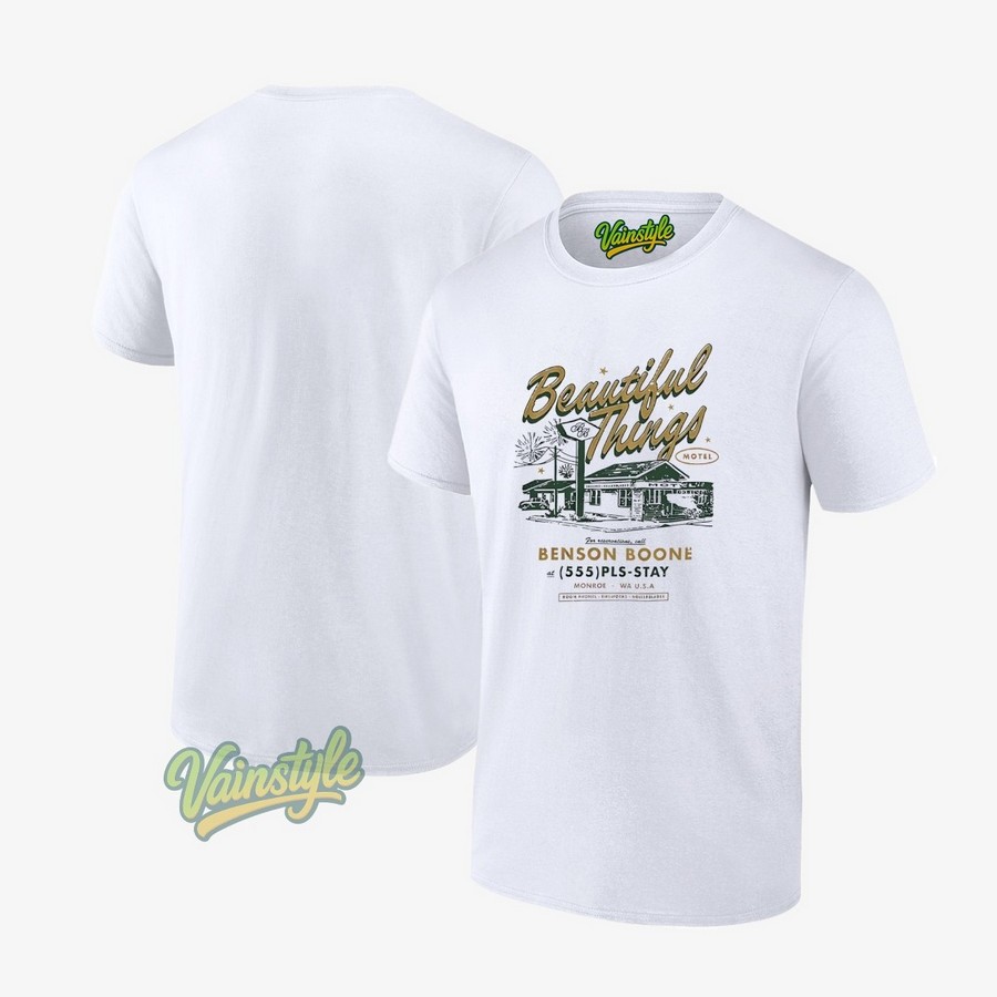 Beautiful things motel Benson Boone 555 PLS stay USA T-Shirt is the perfect way to express your love for the viral hit song and its evocative imagery. Inspired by Benson Boone’s chart-topping track Beautiful Things, this tee captures the raw emotion and yearning for connection that resonates with so many fans. The design cleverly incorporates elements from the song’s lyrics and the overall aesthetic, creating a unique and stylish piece of apparel that speaks volumes without saying a word. It’s more than just a shirt; it’s a wearable piece of art that allows you to share your passion for music with the world.