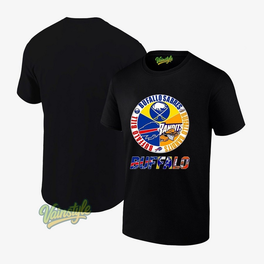 Buffalo Sabres Buffalo Bills Buffalo Bandits logo Buffalo city 2023 T-Shirt: Show your unwavering pride for the city of Buffalo and its powerhouse sports teams with this officially inspired commemorative tee! This unique design celebrates the shared spirit and passion that unites fans of the Buffalo Sabres (NHL), the Buffalo Bills (NFL), and the Buffalo Bandits (NLL). It’s the perfect way to represent your love for all three teams in one stylish and comfortable shirt.