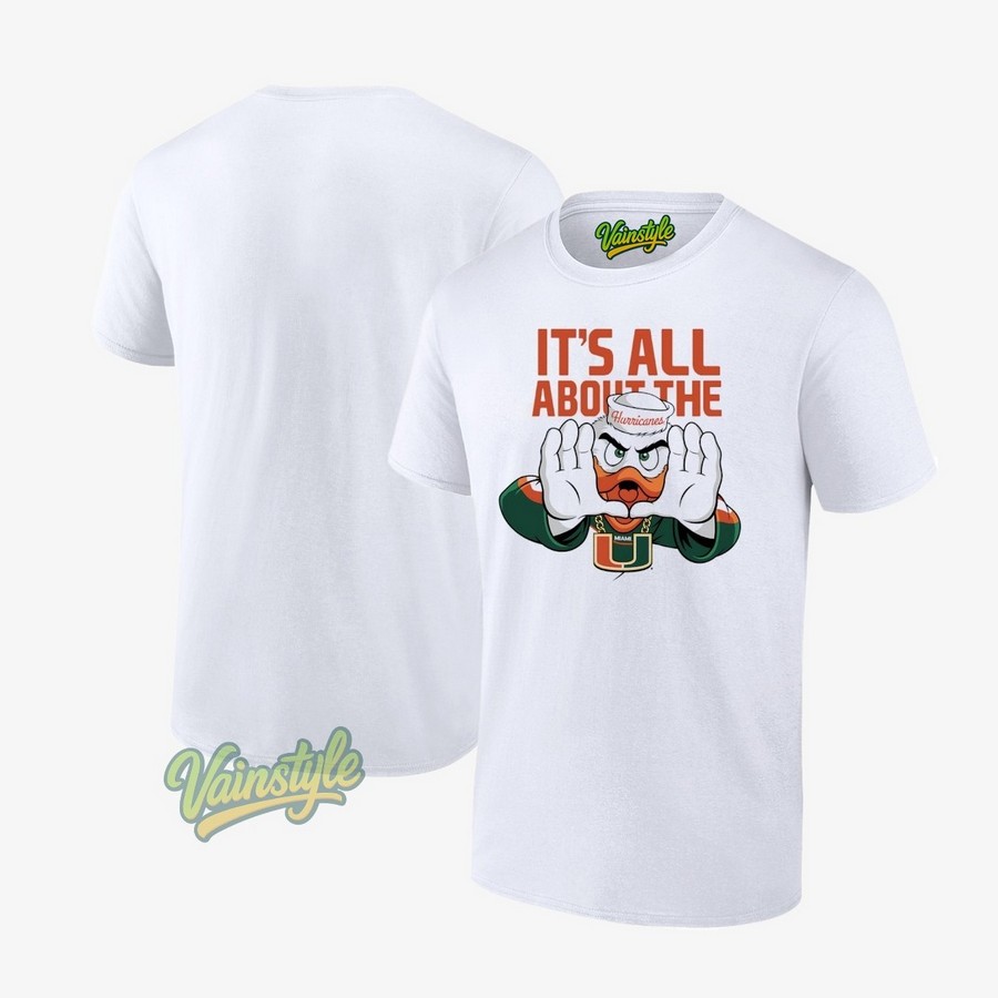 It’s All About The Miami Hurricanes Mascot T-Shirt, the ultimate way to showcase your unwavering support for the University of Miami Hurricanes! Whether you’re cheering from the stands at Hard Rock Stadium, tailgating with fellow ‘Canes fans, or simply representing your alma mater around town, this tee is a must-have for any true Miami Hurricanes enthusiast. Show off your pride with this stylish and comfortable shirt featuring the iconic Miami Hurricanes mascot, Sebastian the Ibis.