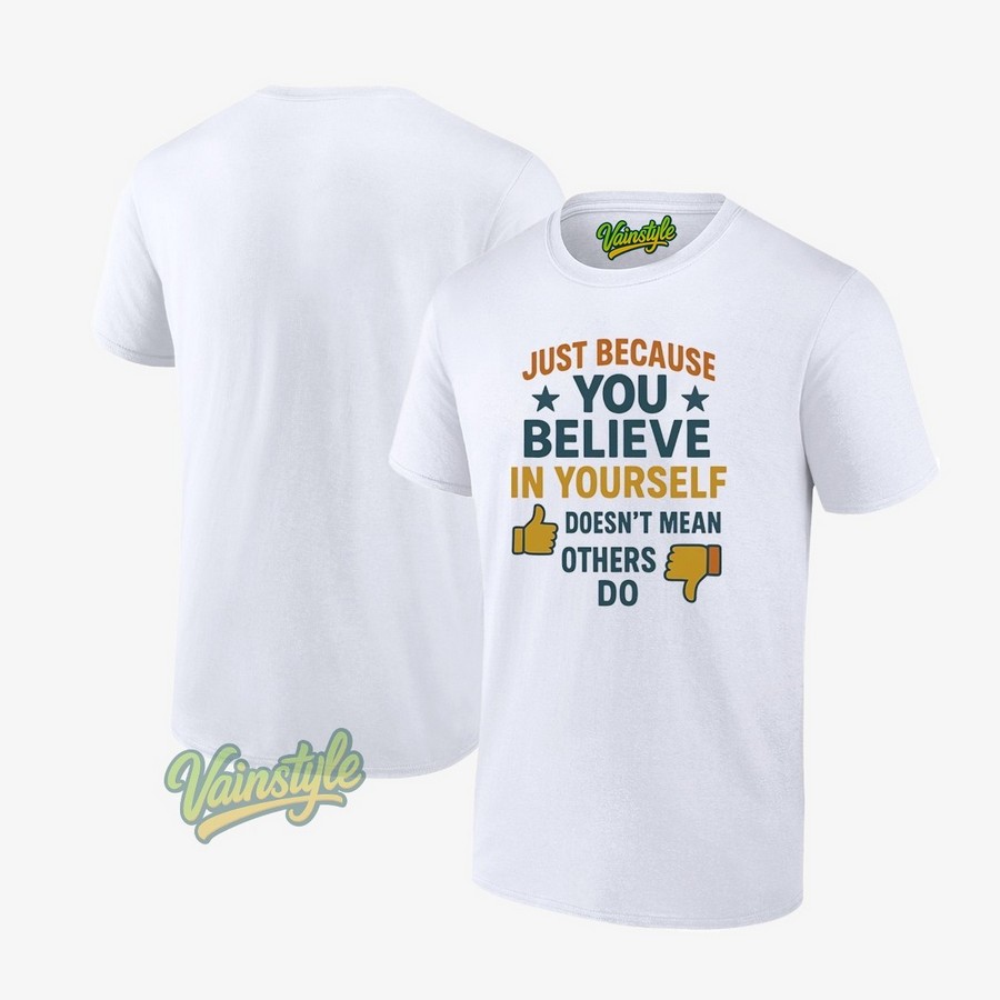 Just Because You Believe In Yourself Doesn’t Mean Others Do T-Shirt – a brutally honest yet humorous take on the realities of pursuing your dreams. This shirt speaks to the inner drive we all possess, juxtaposed against the external challenges of navigating a world that doesn’t always share our optimism. It’s a statement piece for anyone who’s ever faced skepticism, a badge of honor for the self-starter, and a subtle reminder that self-belief is your strongest asset, regardless of external validation.
