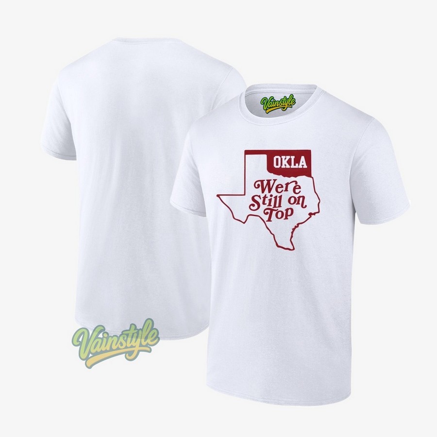 Okla Oklahoma We’re Still On Top T-Shirt is the perfect way to show your unwavering support for the Sooners! Whether you’re heading to a game at Owen Field, cheering from your couch, or just want to represent your state pride, this tee makes a bold statement. After another thrilling season, let everyone know that Oklahoma’s football legacy remains strong and that the crimson and cream spirit burns brighter than ever.