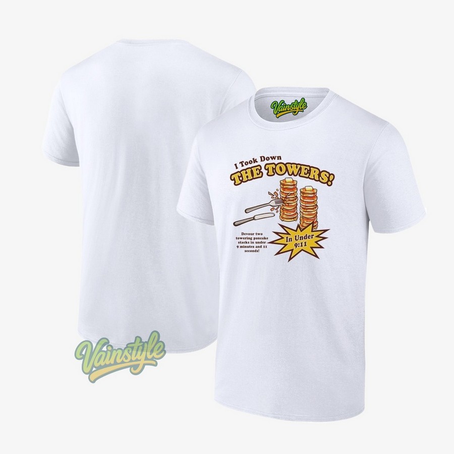 The design features a stack of fluffy pancakes, strategically arranged (or perhaps disastrously arranged, depending on your perspective) in a way that subtly resembles the iconic skyline of the Twin Towers. The phrase I Took Down The Towers is emblazoned above, making the joke undeniably clear (and intentionally absurd). It’s a conversation starter, a head-turner, and a piece of wearable satire that’s perfect for anyone who appreciates the lighter side of life, even when dealing with serious topics. We know this design won’t be for everyone, and that’s okay. It’s aimed at a specific audience with a particular sense of humor.