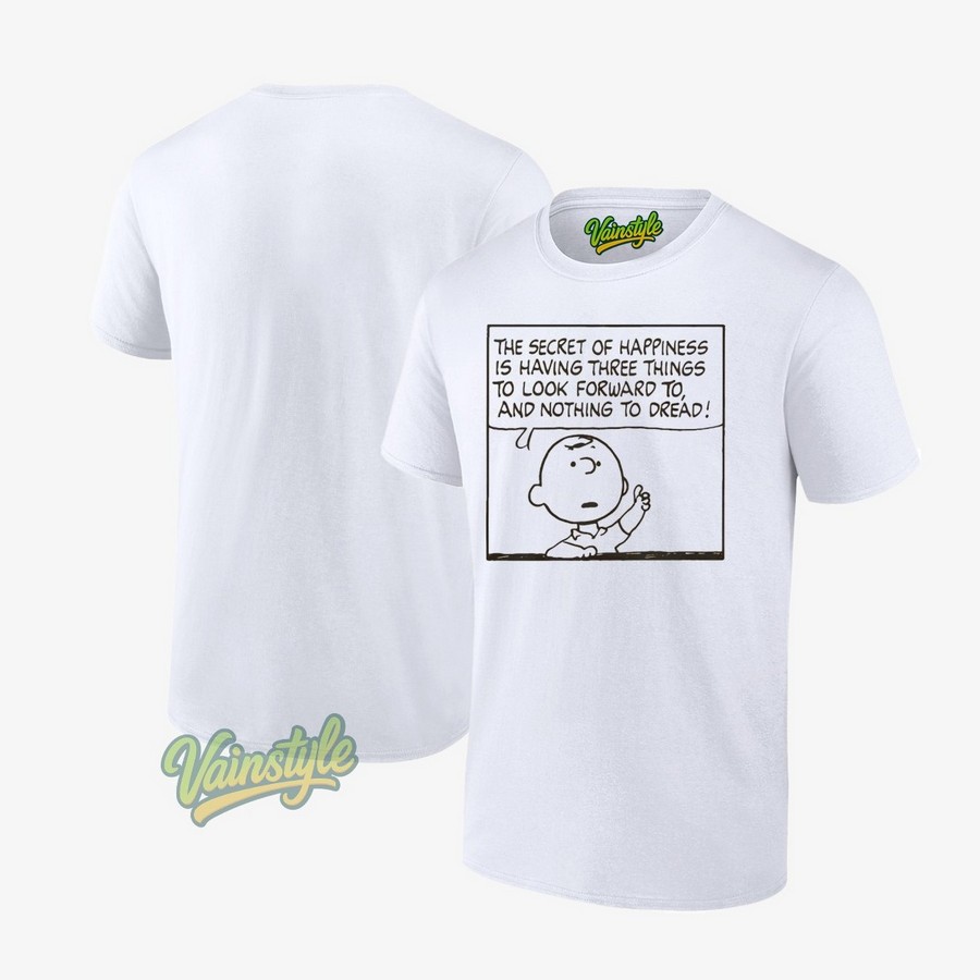 Crafted from high-quality, breathable cotton, this Peanuts Charlie Brown The Secret Of Happiness Is Having Three Things To Look Forward To T-Shirt offers exceptional comfort and durability. It’s available in a range of sizes to ensure a perfect fit. The print is designed to withstand numerous washes, maintaining its vibrant colors and sharp details. At Vainstyle.com, we are committed to providing officially licensed merchandise that meets the highest standards of quality and authenticity, giving you peace of mind with your purchase.