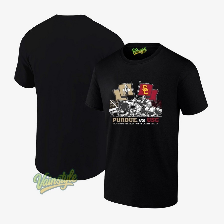 Purdue Boilermakers vs USC Trojans ross-ade stadium West Lafayette IN T-Shirt is the perfect way to commemorate an epic clash between two legendary college football programs at the iconic Ross-Ade Stadium. Show your Purdue pride or celebrate your Trojan allegiance with this stylish and comfortable tee, a must-have for any true college football fan who witnessed (or wished they had) this unforgettable game.
