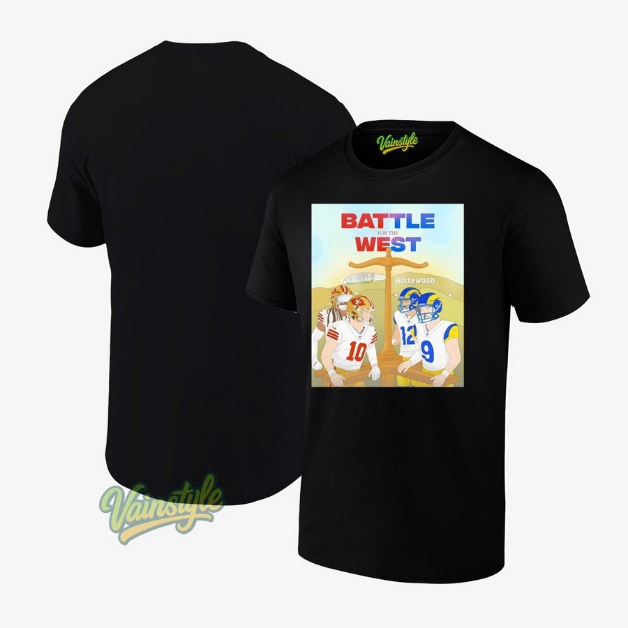 The rivalry between the San Francisco 49ers and the Los Angeles Chargers is always intense, and this shirt amplifies that excitement. Both teams have a strong following in Southern California, and the “Battle For The West Hollywood” theme adds a local flavor to the classic rivalry. The design likely incorporates the team’s colors in a way that complements each other, symbolizing the competitive spirit while remaining visually appealing.