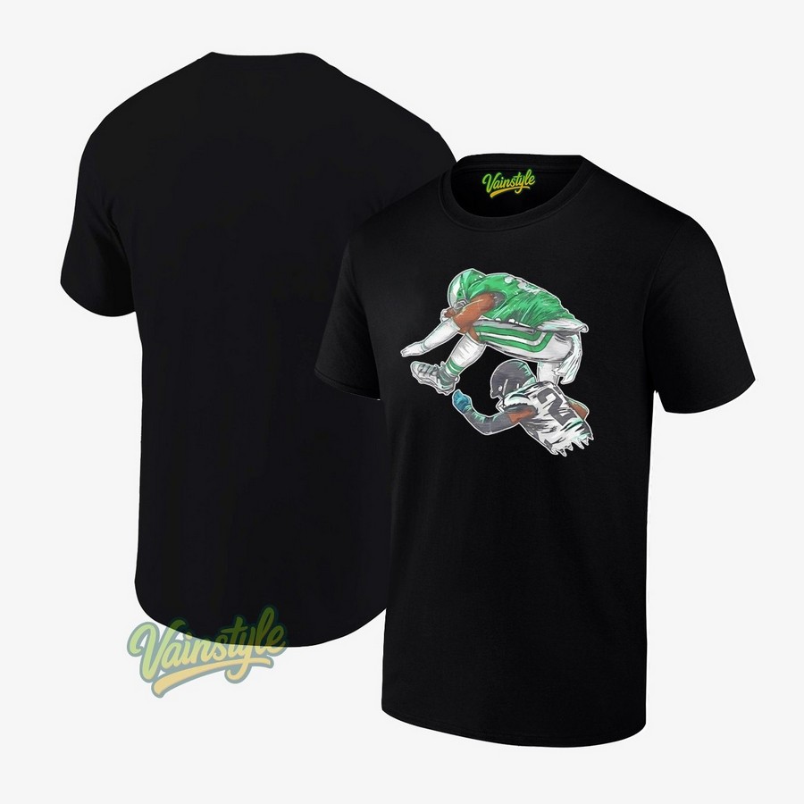 Saquon Barkley Jaw-Dropping Reverse Hurdle Philadelphia Eagles T-Shirt is the perfect way to commemorate one of the most electrifying plays of the 2024 NFL season! Relive the iconic moment when Saquon Barkley, now proudly wearing the midnight green, defied gravity and evaded defenders with his incredible reverse hurdle. This t-shirt captures the raw athleticism and excitement that Barkley brings to the Philadelphia Eagles, making it a must-have for any true fan. Show your support for the Eagles’ newest weapon and celebrate his arrival in Philly with this unique and stylish piece of apparel.