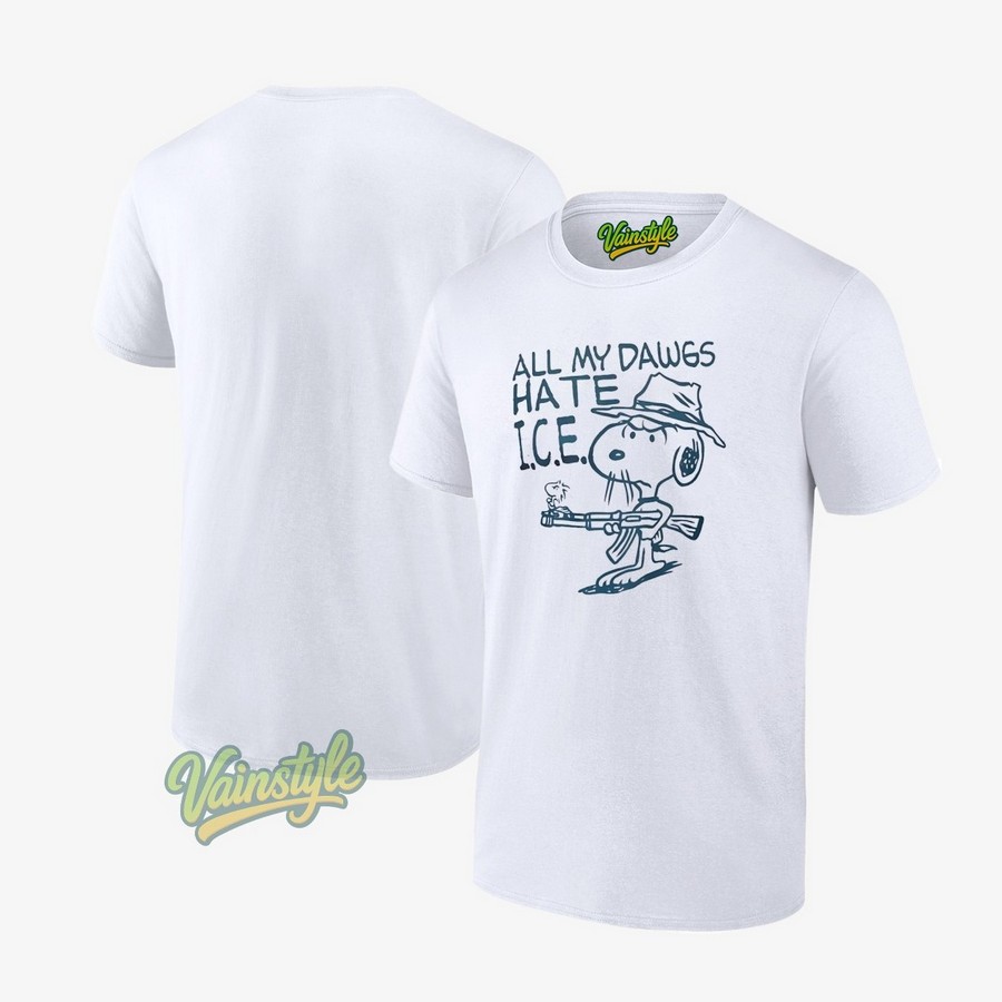 Snoopy all my dawgs hate ICE T-Shirt – express your unique sense of humor and social commentary with this bold and playful tee. Featuring everyone’s favorite beagle, Snoopy, alongside a witty and pointed message, this shirt is sure to turn heads and spark conversations. It’s a statement piece that combines iconic cartoon imagery with a contemporary cultural sentiment.