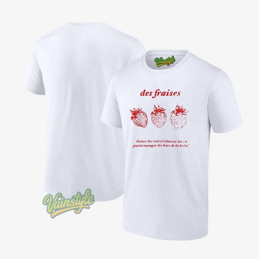 Strawberries have long been a symbol of sweetness, love, and summer. They evoke feelings of sunshine, picnics, and carefree moments. The Des Fraises element adds a touch of sophistication and European flair, making this t-shirt a unique and eye-catching piece. It’s a subtle nod to high fashion while remaining accessible and fun. Wear it with your favorite jeans, a skirt, or even layer it under a blazer for a more dressed-up look. The versatility of this t-shirt makes it a fantastic addition to any wardrobe.