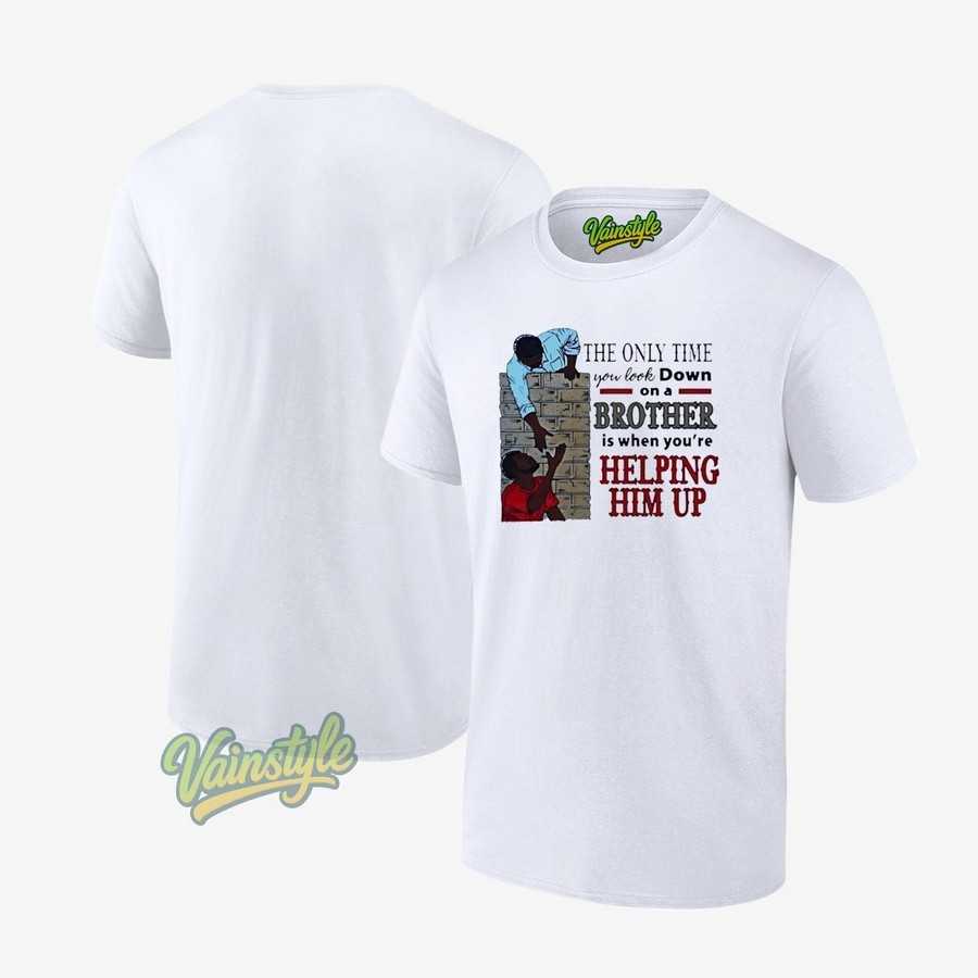 Don’t miss the opportunity to make a statement and support a powerful message. Show your commitment to brotherhood and uplifting others. Visit Vainstyle.com today to Buy The Only Time You Look Down On A Brother Is When You’re Helping Him Up T-Shirt and join the movement of spreading positivity and support.