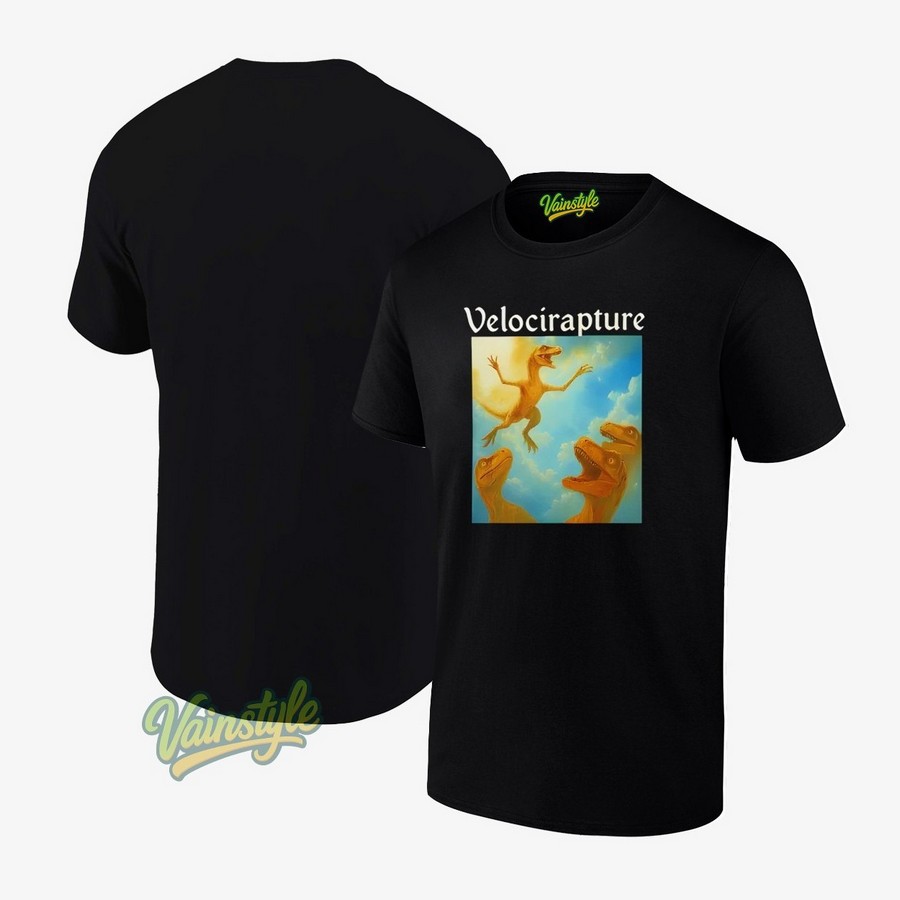 The “Velocirapture” concept also plays on the inherent humor found in juxtaposing the serious with the absurd. A T-Rex, the ultimate symbol of earthly power and dominance, being caught up in a divine event? It’s a comical image that appeals to those with a playful sense of humor and an appreciation for clever design. It’s a conversation starter, a way to express your individuality, and a testament to your unique sense of style. You can find more original designs like this at Vainstyle.com.