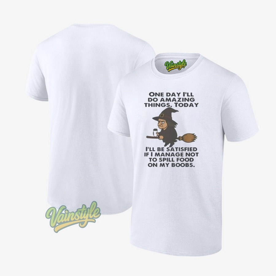 Don’t wait any longer to add this unique and hilarious tee to your wardrobe. Embrace your inner witch, acknowledge the daily food-related struggles, and show the world that you’re ready to take on anything (as long as you don’t spill your coffee). Order now and Buy Witch One Day I’ll Do Amazing Things Today I’ll Be Satisfied If I Manage Not to Spill Food On My Boobs T-Shirt today and let the good times (and hopefully, no spills!) roll!