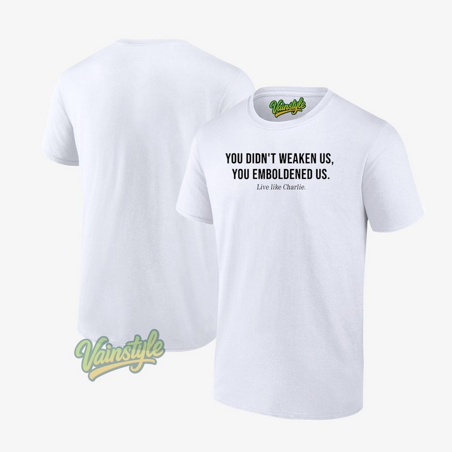 You Didn’t Weaken Us You Emboldened Us Live Like Charlie T-Shirt is more than just apparel; it’s a statement. It’s a powerful emblem of resilience, freedom of expression, and unwavering solidarity in the face of adversity. This shirt serves as a constant reminder of the importance of standing up for what you believe in, even when facing immense pressure. It honors the spirit of those who courageously championed freedom of speech and reminds us to never let fear silence our voices.